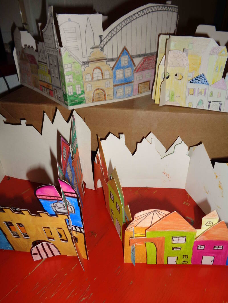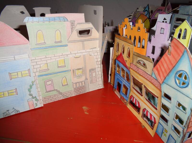 Die Schüler:Innen der Oberstufe konstruierten im Steckprinzip Häuserfassaden, aufbauend mit Tiefenwirkung durch Fenster- und Türöffnungen.