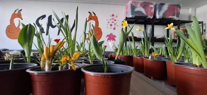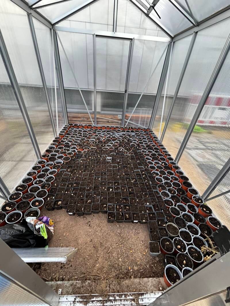 Damit wird ein ökologisch nachhaltigeres Angebot geschaffen, welches nicht nur den Freunden, sondern auch den Insekten zugutekommt, die im Frühjahr auf der Suche nach Nahrung sind. Darüber hinaus können die Zwiebeln ausgepflanzt und vermehrt werden. Über 500 Töpfe mit jeweils fünf verschiedenen Blumenzwiebeln hat das engagierte SMV-Team mit Frau Kaltenbach bepflanzt. Die Frühlingsgrüße dürfen nun in unserem Schulgartengewächshaus überwintern, bevor sie im nächsten März und April verkauft werden.
