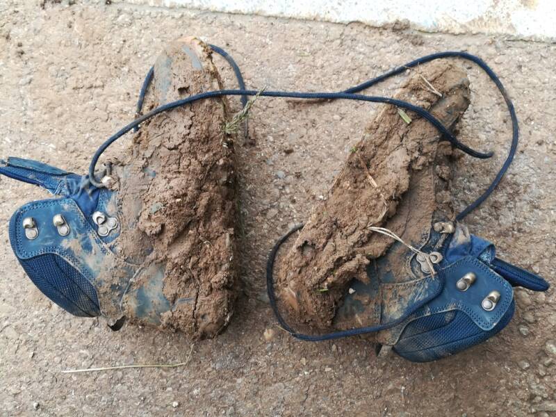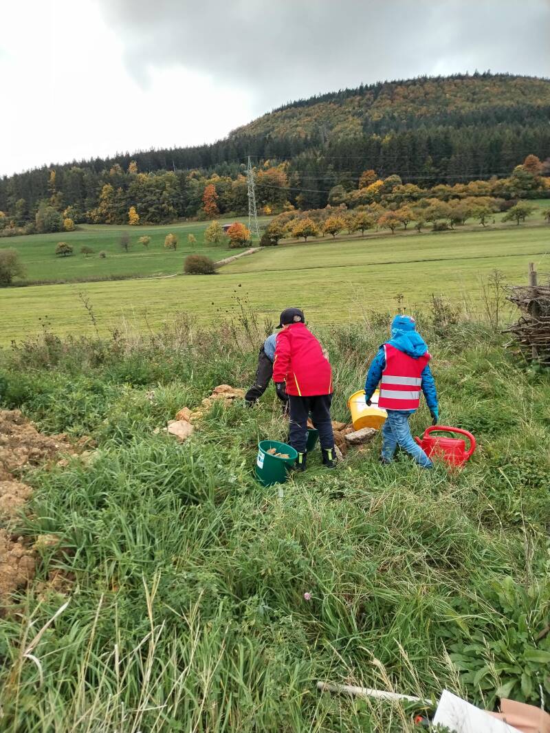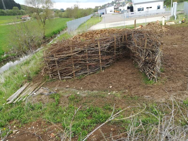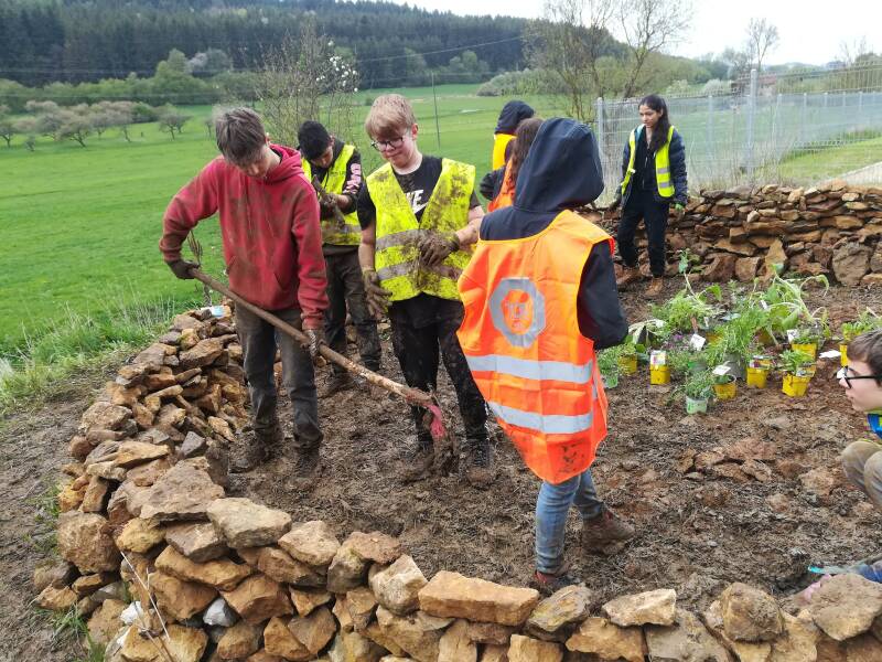 Am Donnerstag, den 05.05.2022 trafen wir uns bei sehr regnerischem Wetter zum zweiten Arbeitseinsatz auf dem Feld. Da es die Tage vorher ebenfalls geregnet hatte, sahen alle nach kürzerster Zeit wie nach einem Bad in einer Schlammpfütze aus. Doch das Wetter konnte weder unseren Arbeitseifer und unsere guten Laune trüben, sodass wir nach vier Stunden die geplante Totholzhecke fertig gestellt, die Steinmauer gesetzt, die gewünschten Pflanzen eingegraben und zusätzlich noch ein Blühwiesenherz angelegt hatten. Die Nisthilfen werden bei einem weiteren Treffen überarbeitet und installiert.