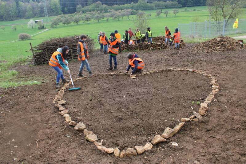 Herr Hauser aus Seitingen-Oberflacht unterstützte uns mit Haselstecken für die Totholzhecke und Frau Mink mit Saatgut mit einheimischen Wiesenblumen, die in dem von uns geformten Steinherz Platz finden und für die Insekten Nahrung und Unterschlupf bieten.