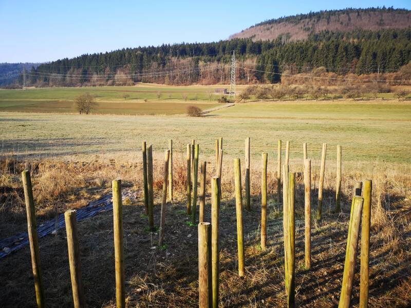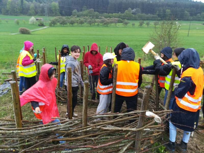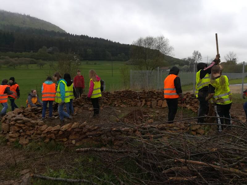 Am Donnerstag, den 24.03.2022 waren wir mittags mit der ganzen Klasse auf dem Feld (in Seitingen- Oberflacht), um uns dort mit der Geschäftsführerin des Naturschutzzentrums in Beuron, Frau Raddatz, dem Bürgermeister von Seitingen-Oberflacht Herr Buhl, Herrn Waldvogel und Herrn Bacher vom Bauhof sowie der Presse zu treffen. Der Bauhof hat uns bereits Steine und Äste für die verschiedenen Bereiche gebracht. Das Totholz wurde für uns vom Obst- und Gartenbauverein Seitingen-Oberflacht gesammelt. Dann haben wir direkt angefangen die Steine zu "schichten" und die Stellen markiert, an die Pfosten der Totholzhecke hin müssen.