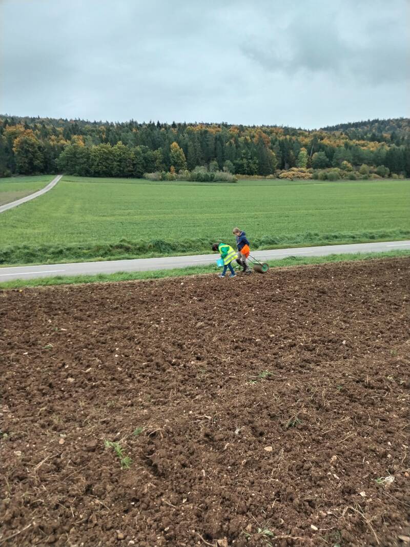 Nach den Sommerferien sah die Fläche dann so aus, wie unter dem Textabschnitt. In Absprache mit der Expertin Frau Schrödinger vom Haus der Natur in Beuron wurden die Pflanzen dann durch die freundliche Unterstützung eines Seitingen-Oberflachter Landwirts umgepflügt. Es keimten dann bestimmte Pflanzen aus, die nach drei Wochen durch feine Bearbeitung unter die Erde gebracht wurden, gleichzeitig aber nicht erwünschtes Saatgut nicht wieder ans Licht befördert wurde. Beim Haus der Natur in Beuron wurde anschließend Wiesensaatgut mit einheimischen Pflanzen bestellt, welches durch die Gemeinde dankenswerterweise finanziert wurde.