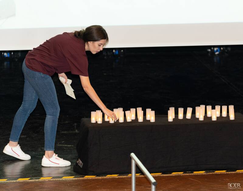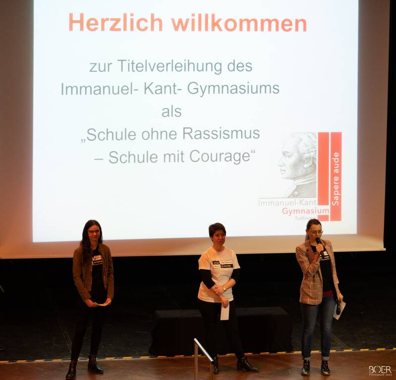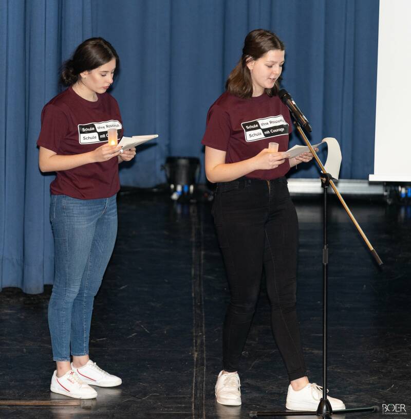 Um den Titel angemessen zu empfangen, hatte die dazugehörende Arbeitsgruppe bestehend aus acht Schülern und Schülerinnen gemeinsam mit ihren drei Lehrerinnen einen feierlichen Rahmen vorbereitet. Um den in der voll besetzten Aula anwesenden Schülern verständlich zu machen, um was es bei dieser Titelverleihung denn geht, hatten die Schüler und Schülerinnen Fälle rechtsextremer Gewalt aus den letzten zwanzig Jahren durch ihre Recherche zusammengetragen. Diese trugen sie vor und stellten für jeden Fall eine Kerze auf. Im Anschluss daran trugen Marcel Conzelmann und Hassan Awada ihre selbst geschriebene und sehr ergreifende Rede vor. Sie gingen dabei auf die Historizität des Datums als passenden Termin für die Titelverleihung ein – diese fand am Gedenktag an die Opfer des Nationalsozialismus statt -, stellten aber auch klar heraus, dass Rassismus und Fremdenfeindlichkeit auch schon im Kleinen beginnen und hierfür beispielsweise auch der eigene Sprachgebrauch stärker reflektiert werden sollte.