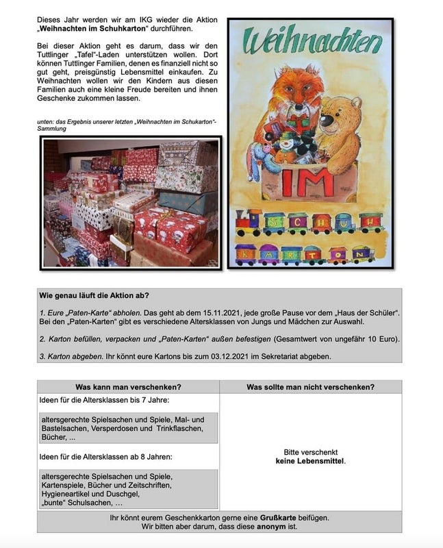 Seit mehreren Jahren beteiligen sich IKG-SchülerInnen und -LehrerInnen zahlreich an unserer Aktion "Weihnachten im Schuhkarton", die wir zugunsten des Tafel-Ladens in Tuttlingen veranstalten.